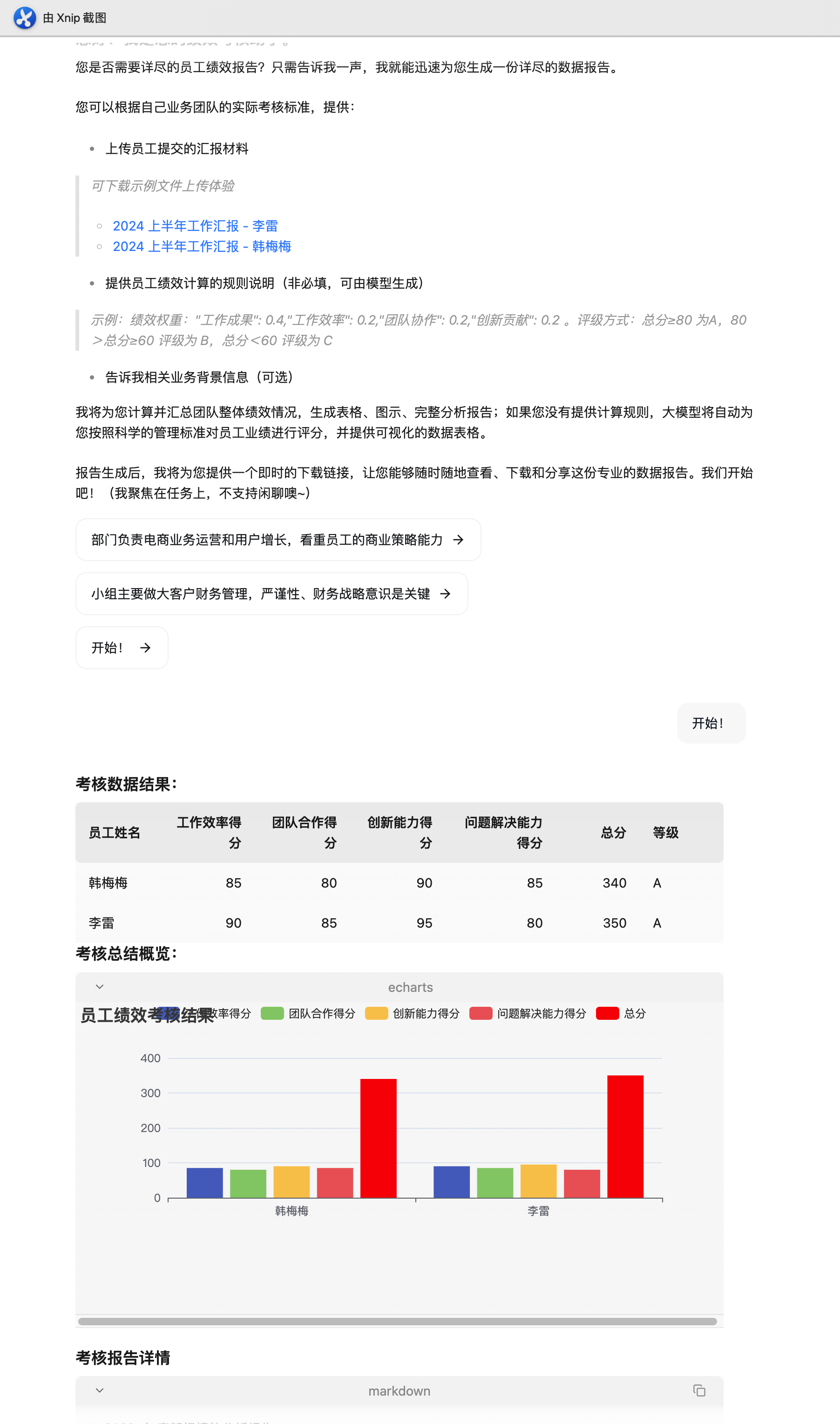 • 动态规则引擎 :根据用户输入的考核标准(如"工作成果:0.4, 工作效率:0.2...")生成计算公式,若未提供则调用 Taichu-LLM-Lite 自动生成科学权重。