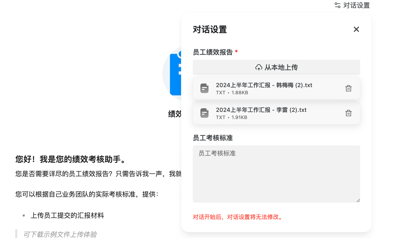 1. 材料准备:上传员工汇报文件(提供示例模板辅助填写)
